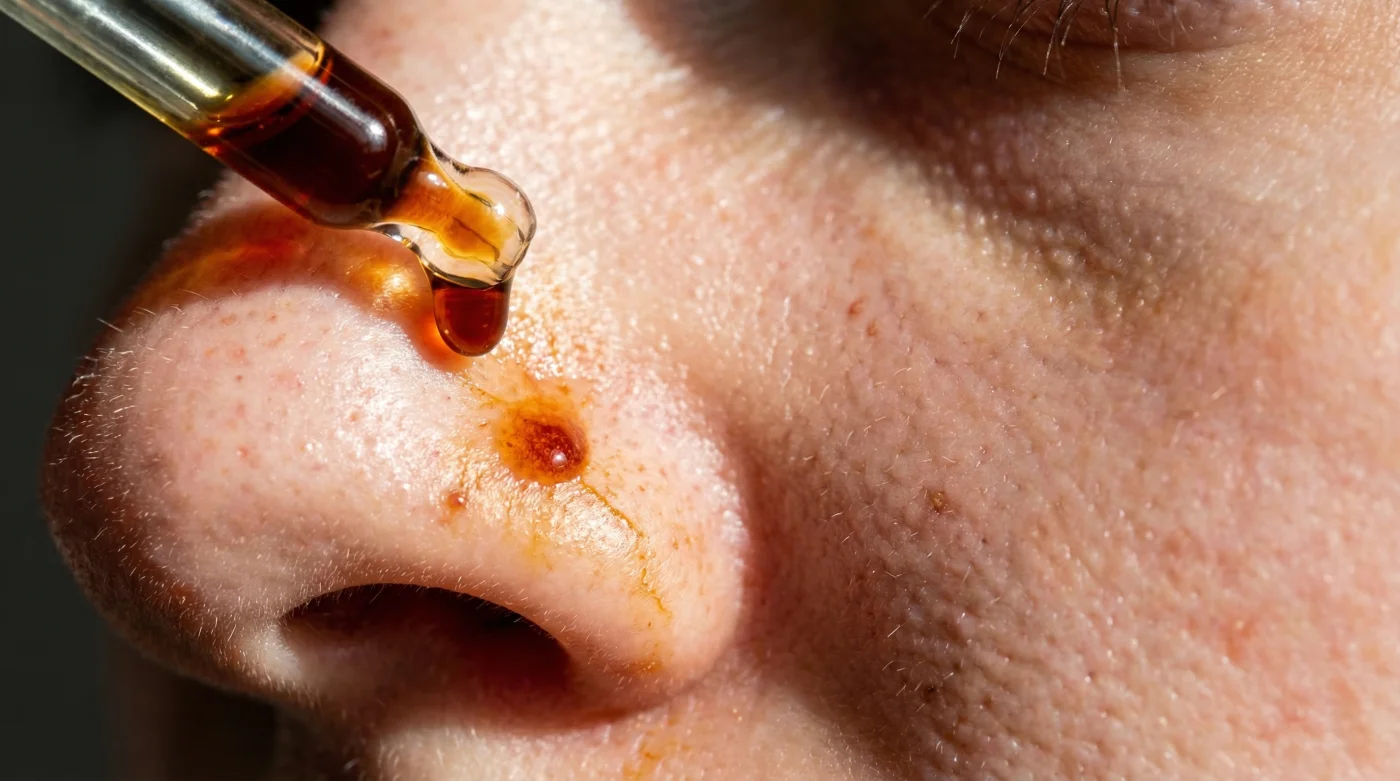 Wenn Sie bemerken, dass Ihre Poren bereits orange gefärbt sind, beenden Sie die Anwendung des Produkts sofort. Ein Oil Cleanser (Reinigungsöl) ist die effektivste Methode, um die lipophilen (fettliebenden) Farbpigmente aus den Poren zu waschen. Ergänzend hilft ein chemisches Peeling mit Salicylsäure (BHA), um die verfärbten oberen Hautschichten abzutragen.